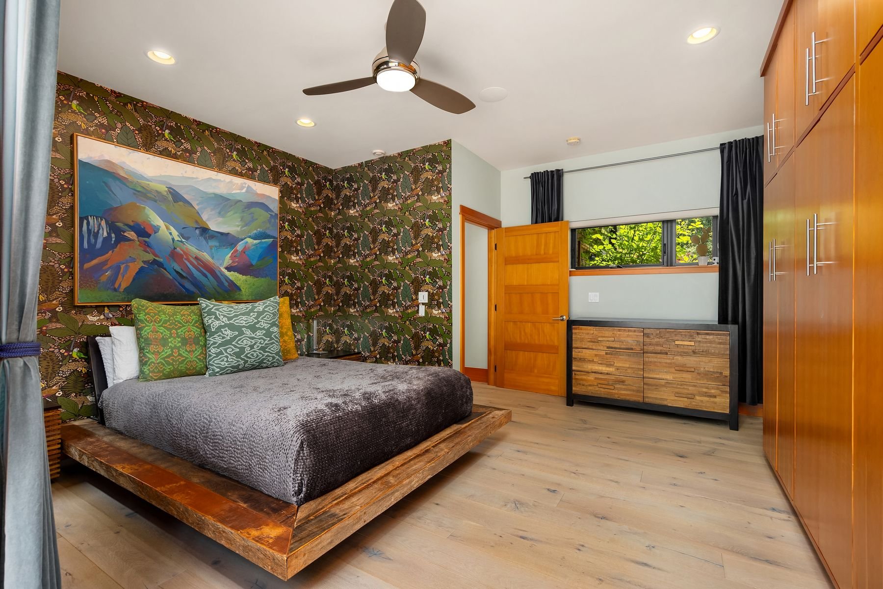 White oak and polished granite floors run throughout, complemented by heating and cooling, radiant in-floor heat, and a generator for added peace of mind.