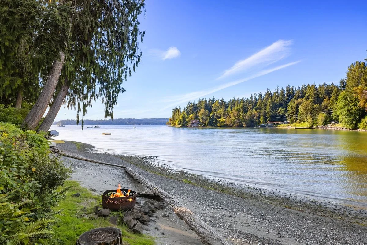 Waterfront Living on Bainbridge Island’s Popular, Little Manzanita Bay, a wildlife haven! Kayaking, paddle-boarding, swimming, canoeing, fishing, sunset barbecues on your own private 175 feet of pristine, sandy shoreline. Classic Northwest Contemporary home set on a shy-acre with a separate, waterfront tax parcel, terraced gardens, two lawns, a patio, kayak-shed and fire pit. The main floor offers a new chef-designed kitchen with granite and quartz counters, high-end appliances, Baywood cabinetry and adjoining dining room. The waterside living room has 10+/- foot ceilings, tall water/garden view windows, wood burning brick fireplace and built-ins. Two upper ensuite bedrooms include the waterside primary suite with a remodeled luxury bathroom, boasting a freestanding soaking tub, tiled shower and double sink vanity. Ground floor offers indoor/outdoor living from the family, bonus, and media rooms with a 3/4 bath and privacy doors for a quiet guest retreat. The home enjoys in-floor heat, has a metal roof and cedar shingle siding. The carriage house has room for a shop and offers an art studio, bonus room and office. Convenient to Battle Point Park, the Grand Forest, Bainbridge Athletic Club and the Meadowmeer Golf Course.