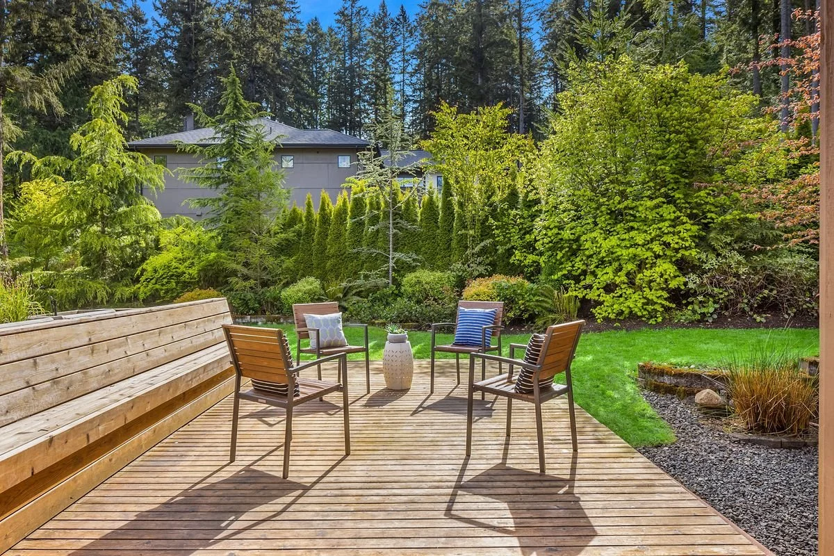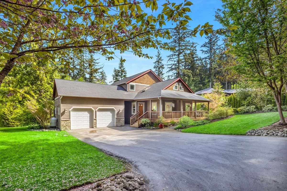 Charming light-filled four-bedroom Craftsman set on two parklike acres graced with expansive lawns and colorful gardens. The spacious two-story great room has tall garden view windows, a propane fireplace, 3/4 inch oak floors, and transoms for plenty of natural light. Indoor/outdoor living from the dining room to the deck, perfect for entertaining and morning coffee! Quality kitchen with butler's pantry, granite counters, stainless steel appliances, propane range/oven, custom cabinets, and in-kitchen dining. Two main floor ensuite bedrooms include the primary suite with rich oak floors, walk-in closet, a five-piece bath, and a door to the garden deck. The second floor offers two bedrooms, a full bath, and a large bonus room. Comfort with heating and cooling and lots of storage with the oversized 2-car garage. Relax to the sound of nature from the covered wrap-around porch. Only a 9 minute drive to the Seattle ferry and a short stroll to the Grand Forest and historic Bainbridge Gardens! Inspection Available Upon Request.